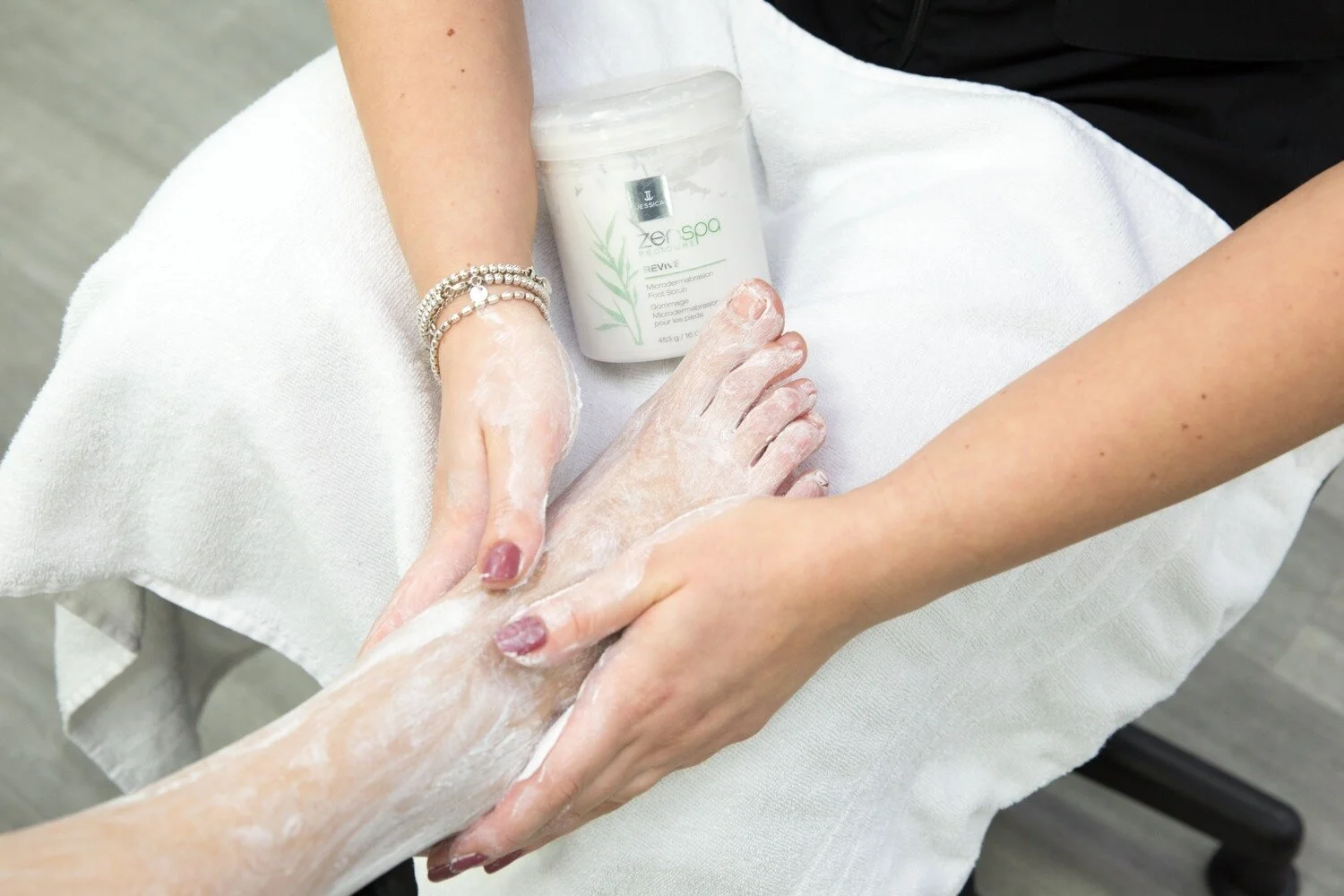 Removal of rough skin, warming foot spa, exfoliation, relaxing foot massage, cuticle work, cut, file and polish.